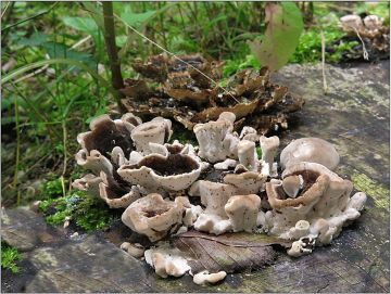 To vevánkovo je asi jasná Trametes versicolor/ochracea. Takhle často začíná. A můj druhý tip je, že právě na bassetových fotografiích je nějaká zparchantělá "obyčejná outkovka", ač na jehličnanu je trošku zvláštní, však myslím, že ne vyloučená.
