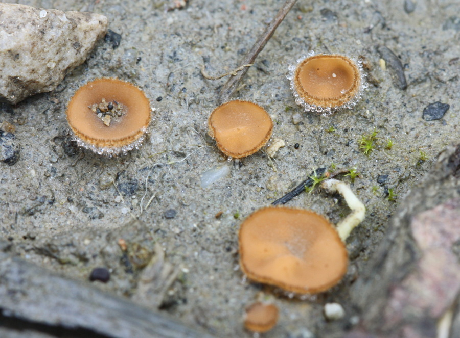 Žlutokosmatka Tricharina ochroleuca (sensu Yang & Korf). Doteď jsem byla ráda, že jsem zatím žádnou žlutokosmatku neviděla, protože jejich určování mi připadalo komplikované a nejasné. Naštěstí jsem díky sobotním nálezům měla důvod si pořádně přečíst článek s příhodným názvem "Ärger mit Tricharina" (Žlutokosmatky pro zlost), kde autor nejdřív popsal všechny trable s určováním žlutokosmatek podle toho či onoho autora (pojetí některých druhů se očividně v literatuře silně rozcházejí), posléze zavrhl obvyklé určovací znaky jako délka chlupů nebo rozměry výtrusů jakožto variabilní a nespolehlivé a nakonec uvedl vlastní klíč, založený na znacích jako tvar výtrusů, typ ornamentiky, nebo je-li plodnice napůl zanořená v zemi. Takže odteď určuju podle Lindemanna.