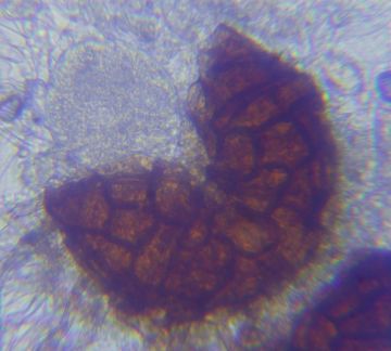 Rozloučím se mikrosnímky. Padlí na heřmánku. Velikost kleistothecií byla zhruba 80 μm v průměru. Zdá se mi, že nacházím druhy s čím dál tím drobnějšími teleomorfami.