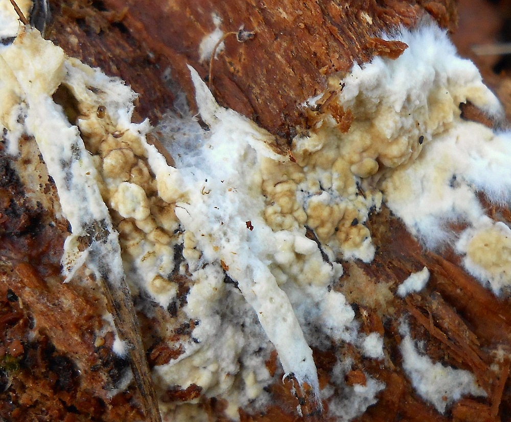 Popraška (Coniophora sp.) ze dřeva borovice (či smrku, substrát jsem příliš nekoumal). Docela dobře se mikroskopují, ale nemám na ně žádný klíč, takže zatím zůstávají neurčené.