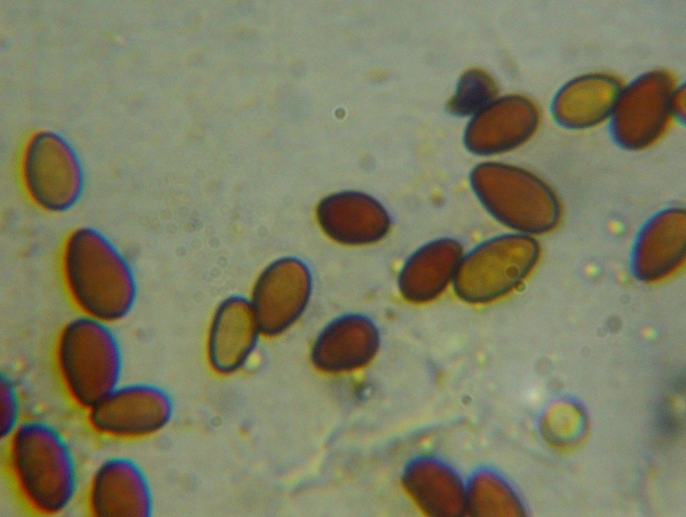 Poslední přidám mikrosnímek dextrinoidních výtrusů (10-13 x 5,5-7 μm) poprašky, obarvených v Melzerově činidle.