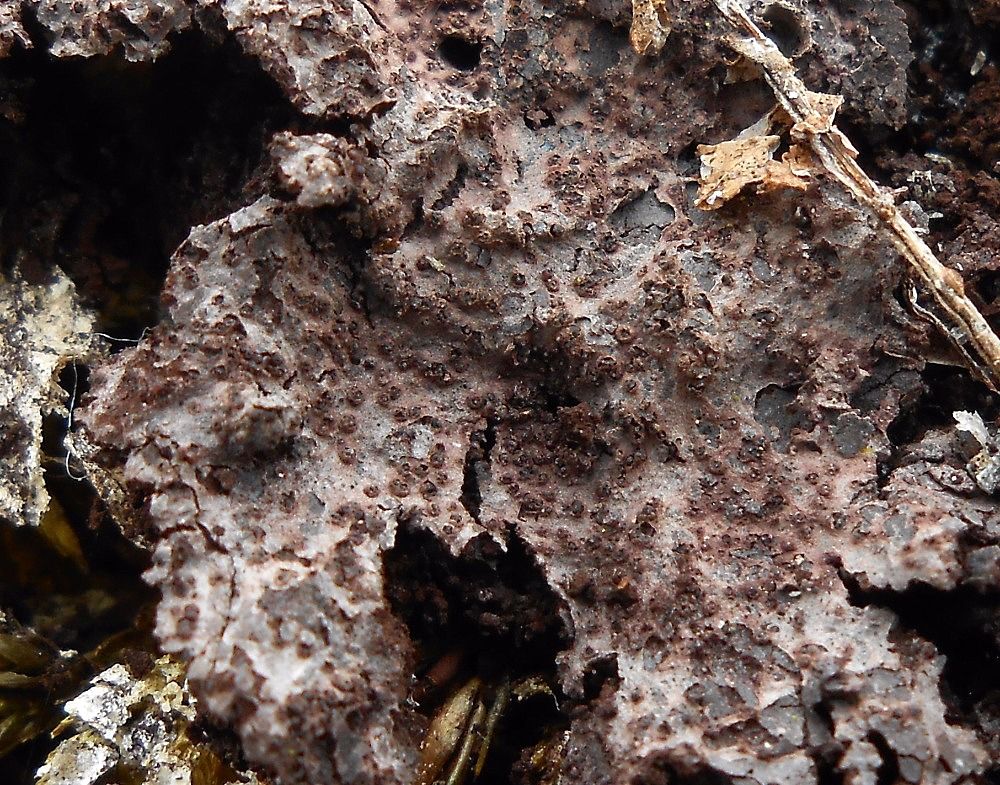 Potěšil nález rážovky fialové (Nectriopsis violacea), která parazituje na slizovkách (Fuligo).