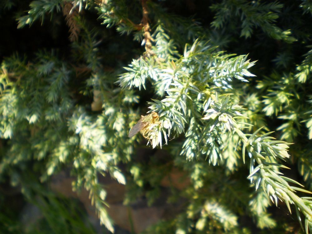 zelená divná moucha, kterou jsem vyfotil na našem jalovci, taky ještě nevím co to je