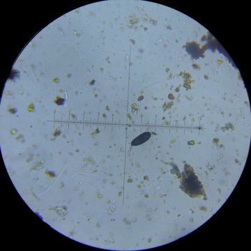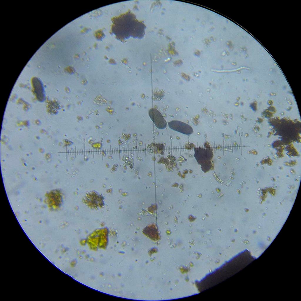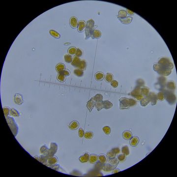 Podle výtrusů bych soudil, že by to mohl být nějaký začínající dřevomor. Nebyla tam náhodou vřecka ?
