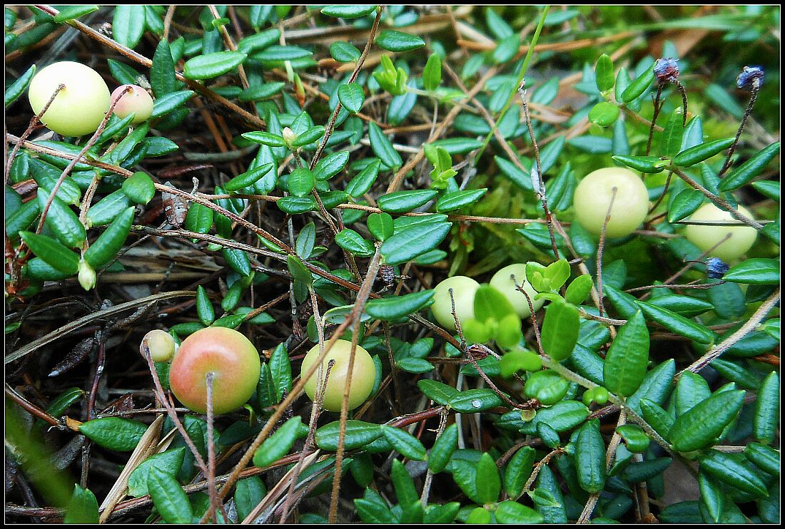 Joj,to su rychlý.Z desátého srpna v Hamru...Ještě jsou klikvy zelené a všimněte si připojení bobulek a tvar lístků...