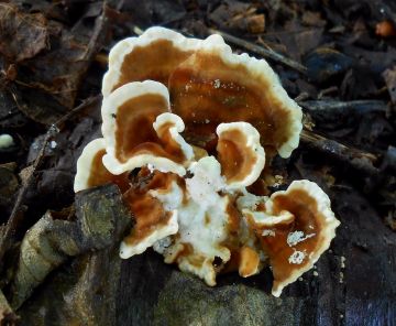 Začnu outkovkou pestrou (Trametes versicolor). Vpravo dole je nějaká zajímavá žlutá drobotina, té jsem si samozřejmě všiml až doma na fotce, snad se tam někdy v blízké době vrátím ji prozkoumat ...