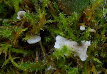 Mecháček síťnatý (Arrhenia retiruga) s největší pravděpodobností na mechu Calliergonella cuspidata.