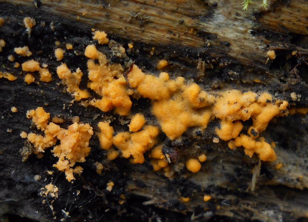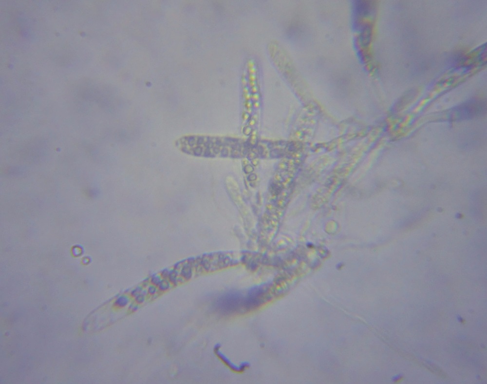 Bactridium flavum nacházím na lokalitě čím dál tím častěji. Druh je pod mikroskopem nápadný obrovskými konidiemi, až 200 µm dlouhým, které jsou dokonce trošku vidět i na fotce. Najdete je ?