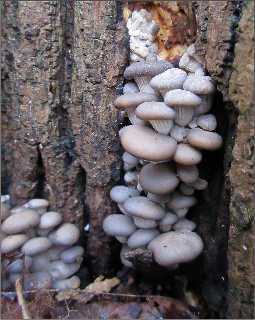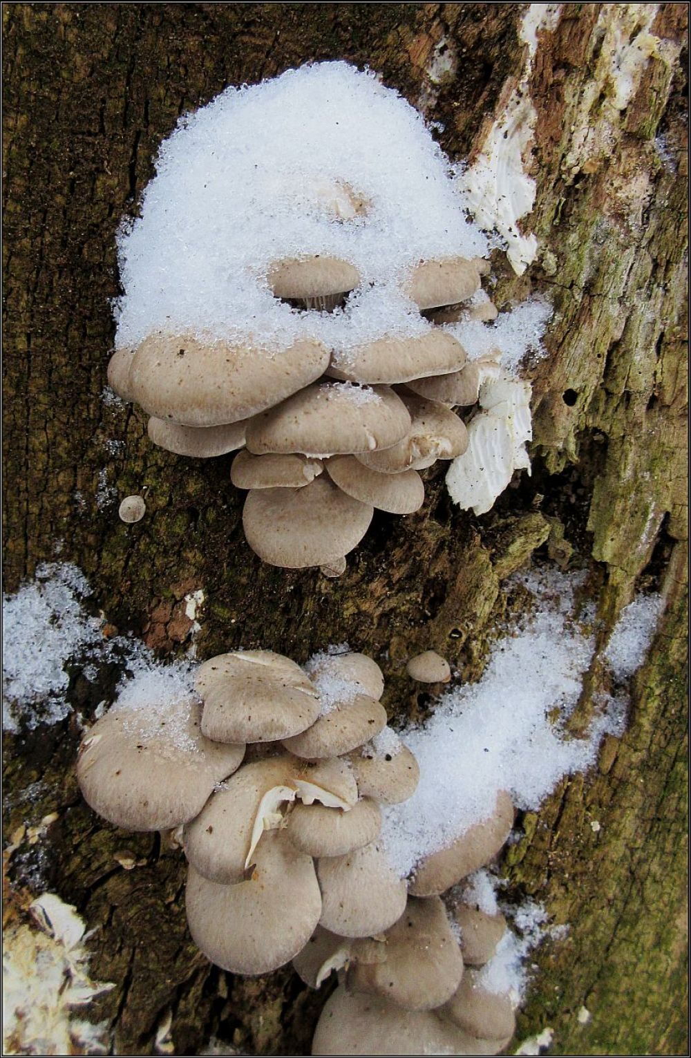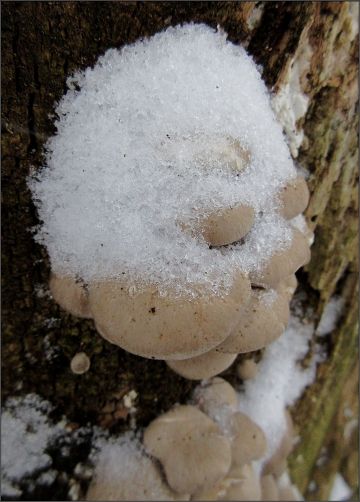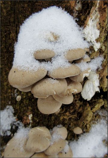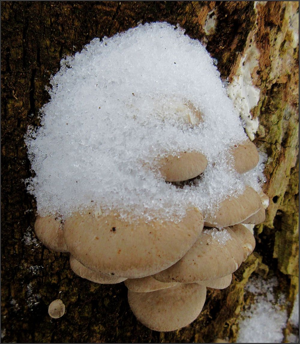 Pečlivě a systematicky monitorovaná hlíva ústřičná se ozdobila sněhovou čepicí, stačil jsem ji ještě cvaknout...Už není...