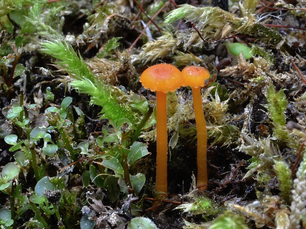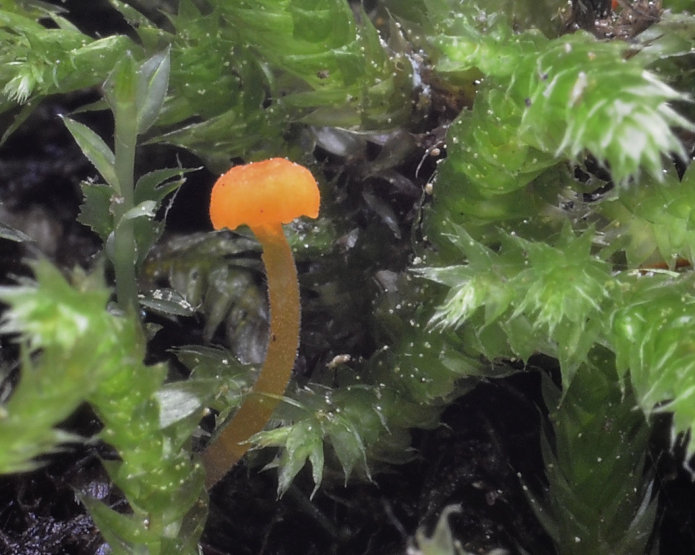 Není to spíš kalichovka oranžová - Rickenella fibula? I biotop, co uvádíš, by seděl.