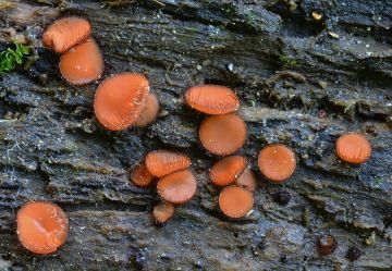 Na silnějších větvích listnáčů, mechem porostlých, vodou omývaných nebo ovlivňovaných, v pokročilém stupni rozkladu, kalichovka oranžová.
