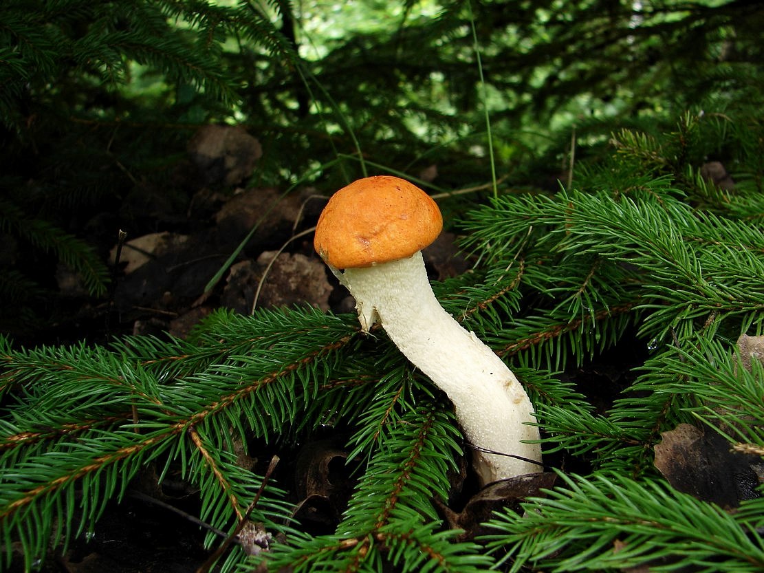 Ale nějaké houby přece dám. Konečně začaly růst křemenáče osikové. Tenhle ale vyrostl na blbém místě, jehlice mu rozedřely celý třeň...