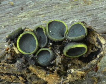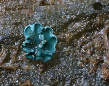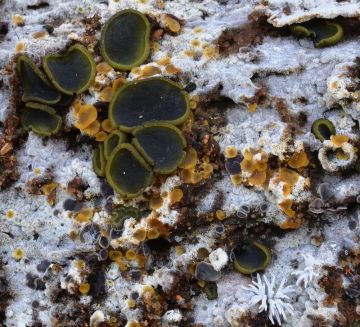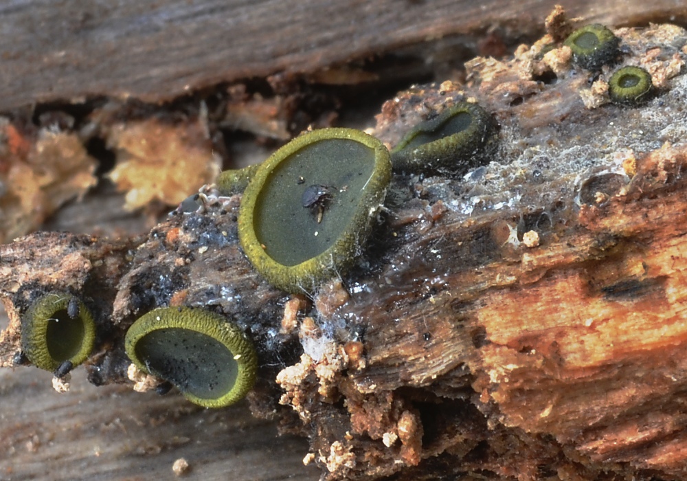 Nedaleko ploskovičky se vyskytuje také zelenitka buková. Tato větší plodnička bude zřejmě srostlice. Škoda toho nepořádku na plodnici, při focení jsem to neviděl. Stačilo by jedno silnější fouknutí a fotka by stoupla v ceně.