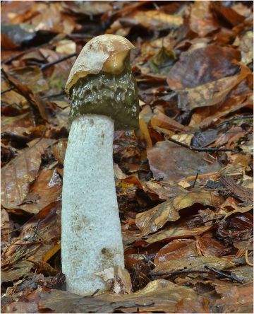 V podmáčených smrčinách ve skupinkách rostou hadovky. Hadovka smrdutá (Phallus impudicus) s pokrývkou hlavy.