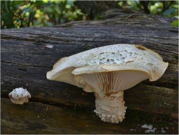 V blízkosti rašeliniště, na ležícím borovém vývratu, rostl houževnatec šupinatý (Neolentinus lepideus).