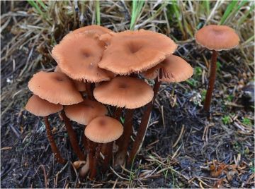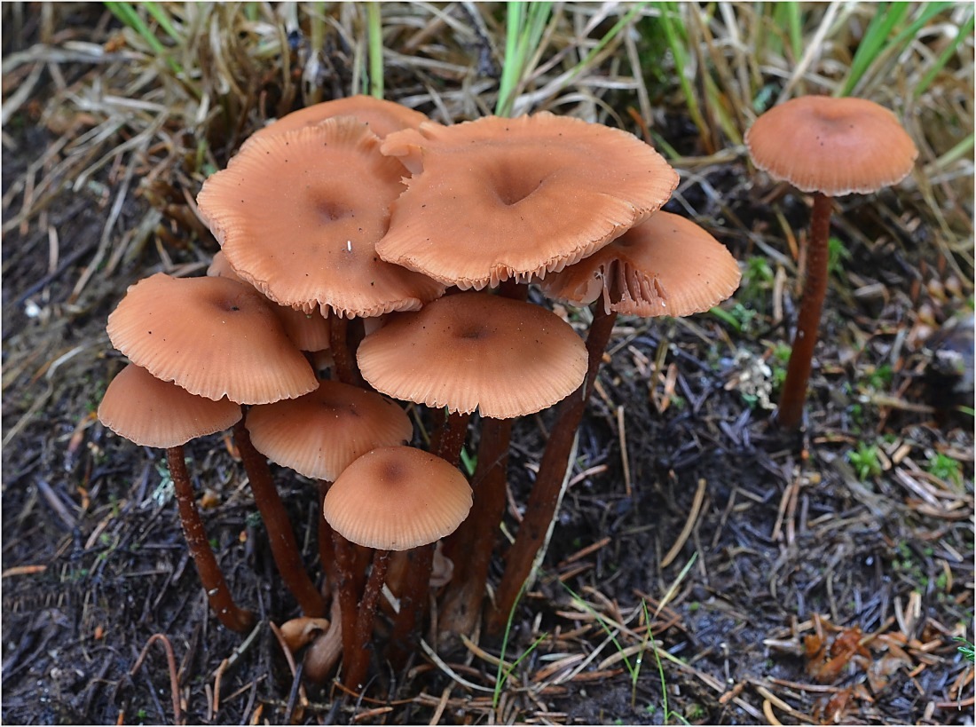 Na hranici smrkového lesa a rašeliniště růst lakovky (Laccaria sp.)
