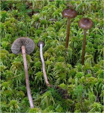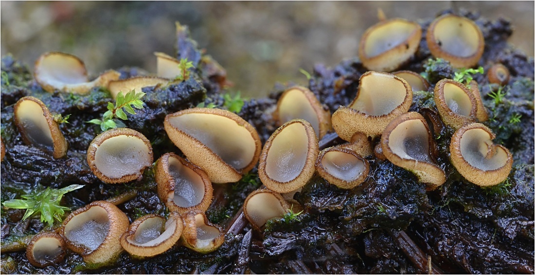 V kobercích rašeliníku rostlo více druhů drobných hub. Jednou z nich je i třepenitka pomněnková (Phaeonematooma myosotis).