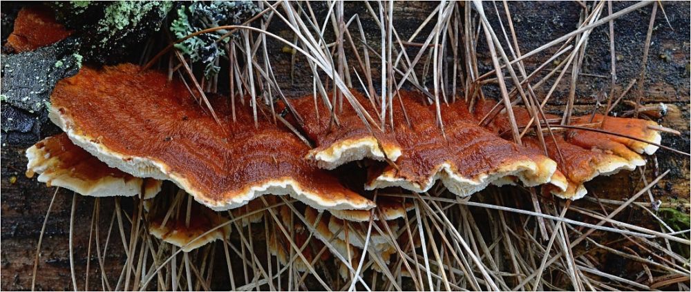 Mezi nimi jakoby zářila tato plodnice oranžovce vláknitého (Pycnoporellus fulgens).