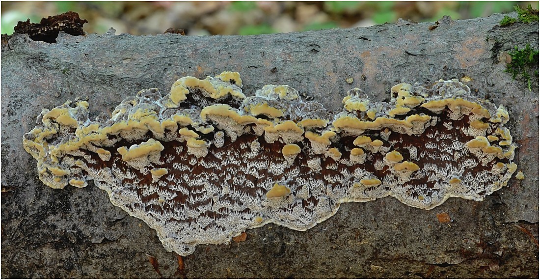 Na čerstvějších bukových vývratech četný výskyt povlaků smolokorky bukové (Ischnoderma resinosum). Tvorba klobouků jen místy.