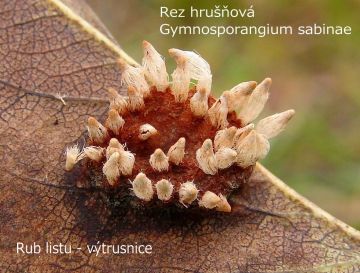a tak jsem se na krásu této rzi, kterou způsobuje houba Gymnosporangium sabinae (obnaženka hrušňová), a kterou jsem viděla poprvé na vlastní oči, nemohla vynadívat.