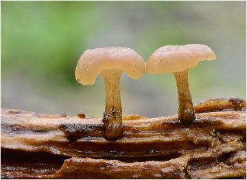 Helmovka dlouhonohá (Mycena speirea), růst na větvičce ponořené ve vodě.