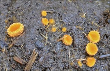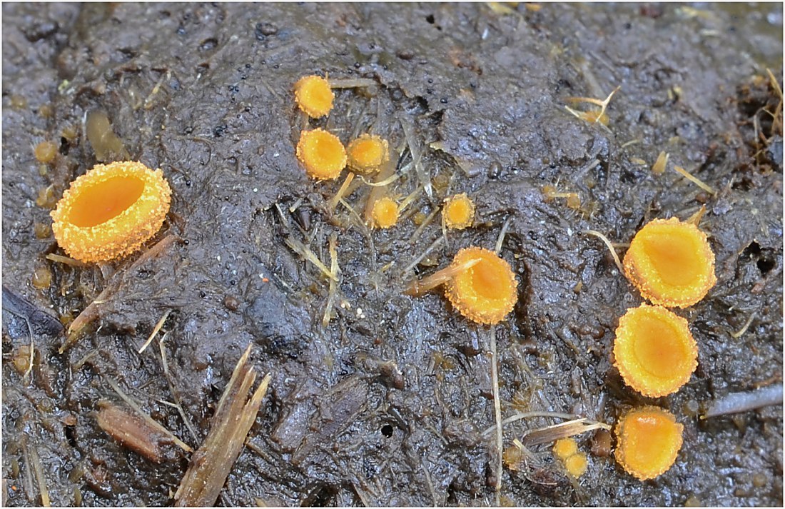 Stejná lokalita, trus spárkaté zvěře. Ze žlutých teček na trusu se po zvětšení vyklubala vzácně se vyskytující mrvenka zrnitá (Cheilymenia granulata).