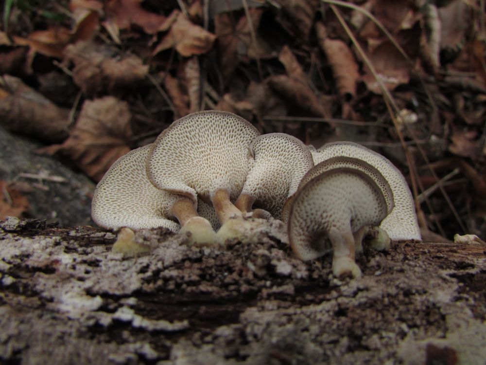 Polyporus arcularius - choroš plástvový - největší, kosočtvercové póry, roste od dubna do července, více v teplejších oblastech