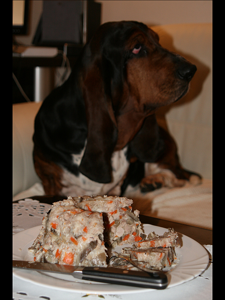 K finálizaci tvaru pokrmu použijte vhodnou nádobu - bábovkovou mísu, srnčí hřbet, pekáček vhodného rozměru. Všechny ingredience promícháte, pak zalijete vývarem z masa. Nezapomeňte osolit. Výsledek přemístíte do připravené nádoby a uklidíte do chladna. Pokud to vydržíte do druhého dne, bude to super. Huspenina se podává mírně popepřená pepřem s chlebem nebo bez. Aby Vám nikdo nescizil očekávaný dlabanec, usadíte v blízkosti svého psa. Blízkostí se v tomto případě myslí taková vzdálenost, aby pes nebyl u vidličky dříve než Vy. K pití nebudu doporučovat nic, protože se už do Vás stejně po celé "bábovce" možní ani nevejde.