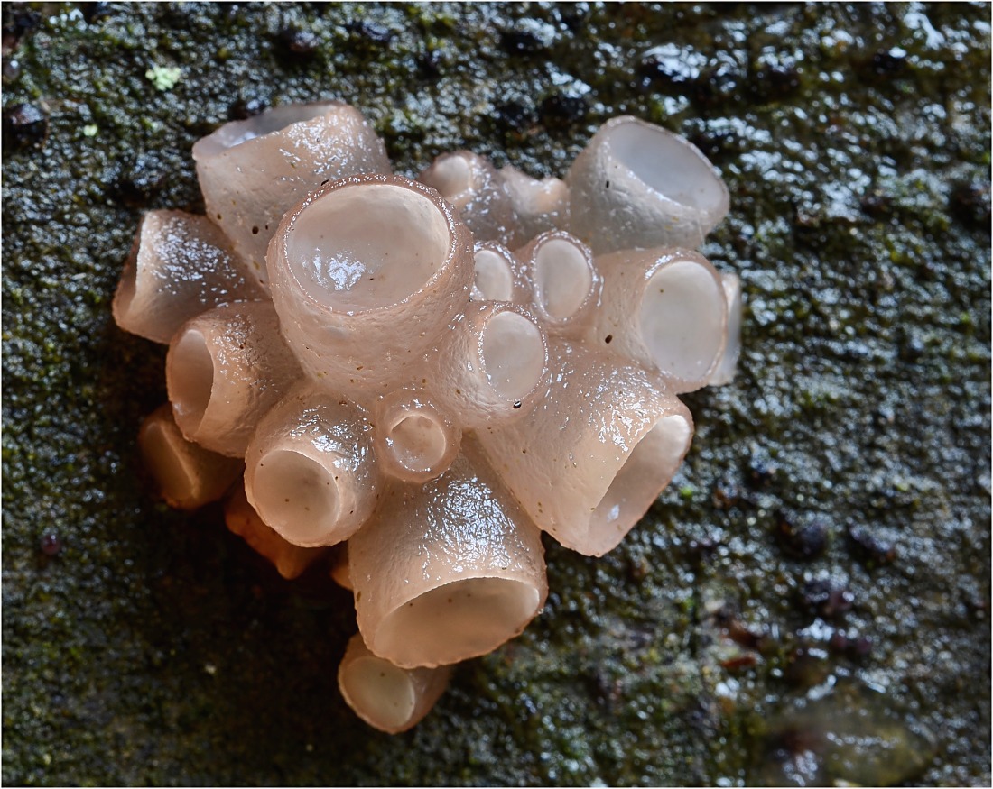 Ve stejné lokalitě, ležící kmen buku, se nalezlo několik skupinek rosoloklihatky čiré (Neobulgaria pura).
