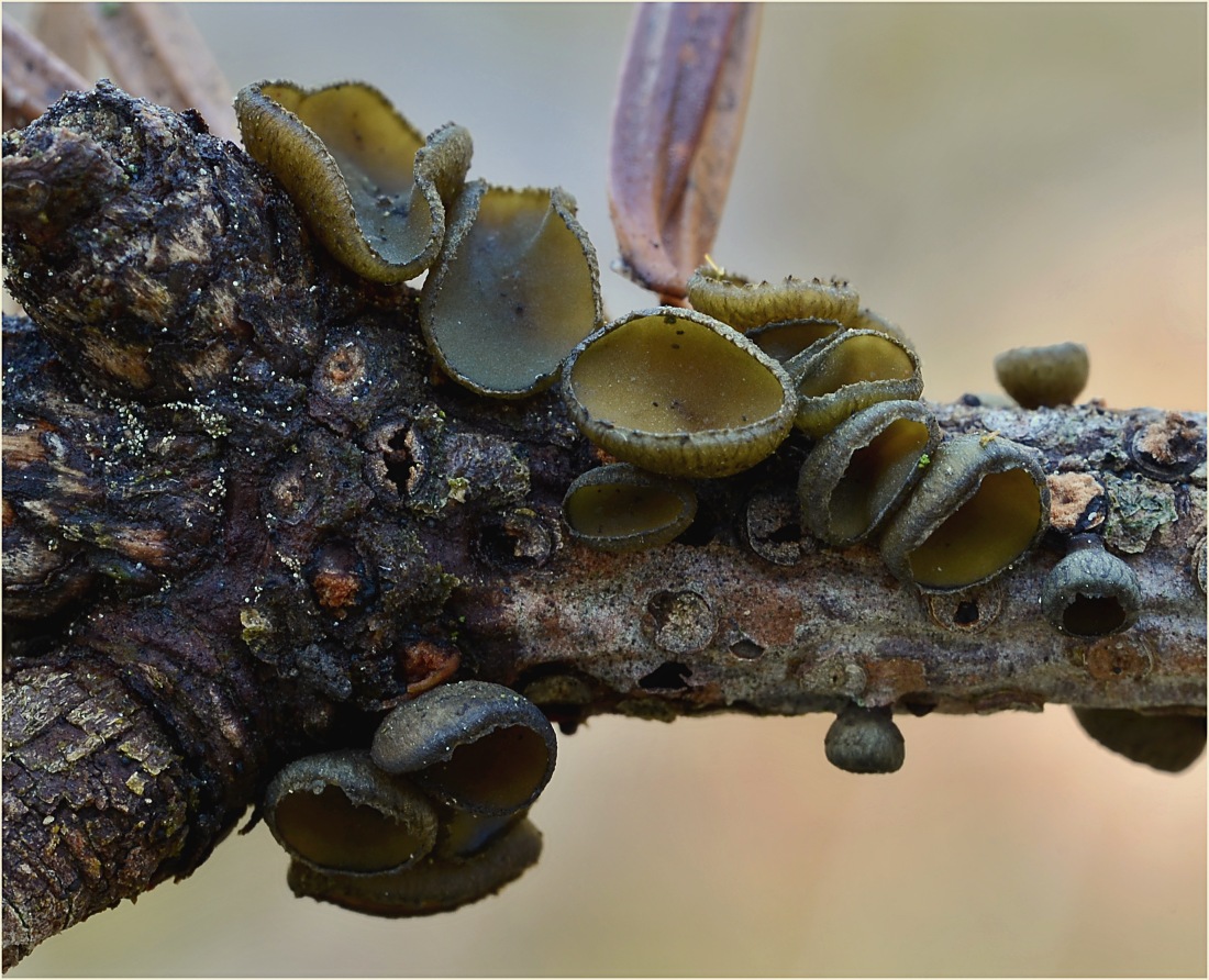 Z jedlového porostu, loňských slabých větévek, tu mám nález terček jedlových (Rutstroemia elatina).