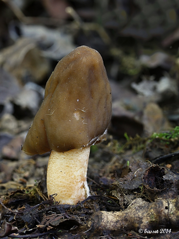 Smrž polovolný - 8 plodnic různých velikostí se dralo z hlubokého listí téměř na stejném místě jako kačenka náprstkovité, jenom pod vyššími jasany. Na klobouku je přesně vidět, jaký kus čněl z listí - je oschlý.