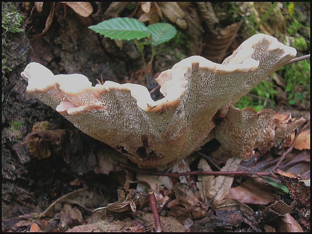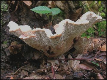 1. plstnateček severský (jo, vidím tam samé listí, ale zkusím to, co když je to pařez jehličnanu...)
