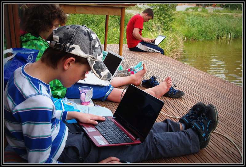 Taky dám prémiový obrázek. Včera jsem byla pozvána na oslavu 10. narozenin mého vnuka Věrouška - a při příchodu se mi naskytl tento obrázek: takto tráví dnešní kluci krásné skoro letní odpoledne na břehu rybníka.....