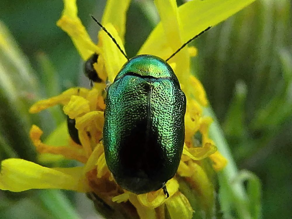 Překrásný brouk, krytohlav Cryptocephalus sericeus na nějakém jestřábníku