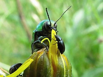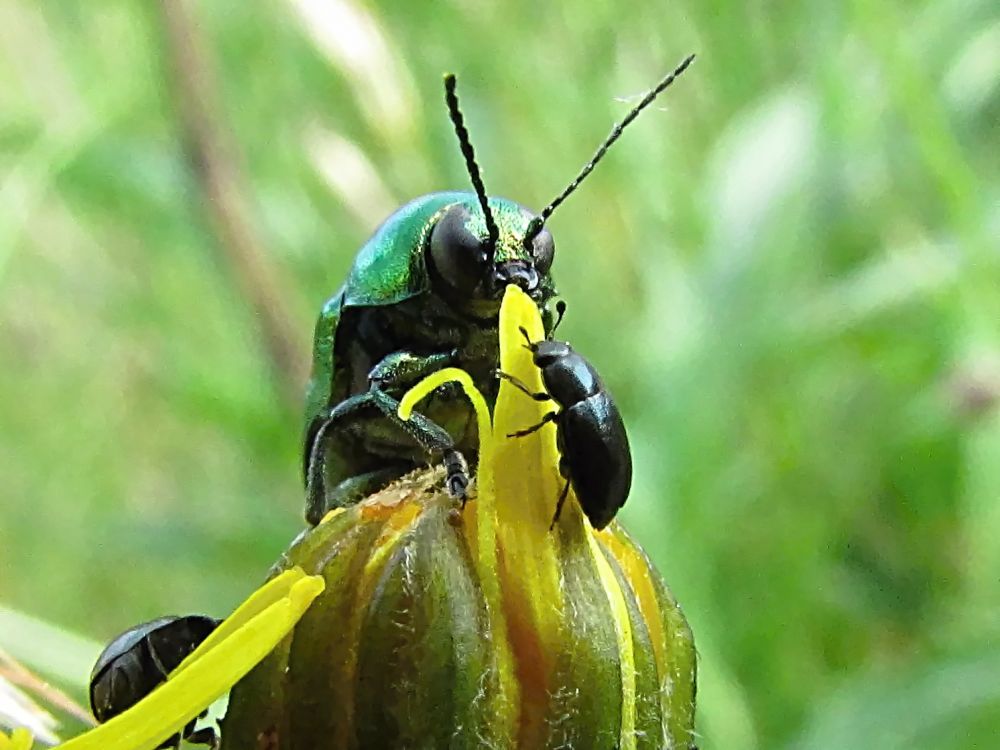 Je to pohostinný brouk, který se o svou večeři podělí i s drobným lesknáčkem