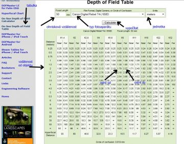Na serveru DOFMaster si lze ovověřit hloubku ostrosti pro jednotlivé fotoaparáty - viz např. obrázek pro můj Canon 650D a ohniskovou vzdálenost 2m od objektivu při cloně F8 je ostrost od 1,79 m do 2,27m. Vybírat lze různé fotoaparáty a každý si tak může nalézt ten svůj, nebo alespoň jemu hodně podobný. Myslím dobrá pomůcka pro každého, kdo si chce něco o hloubce ostrosti ověřit.
