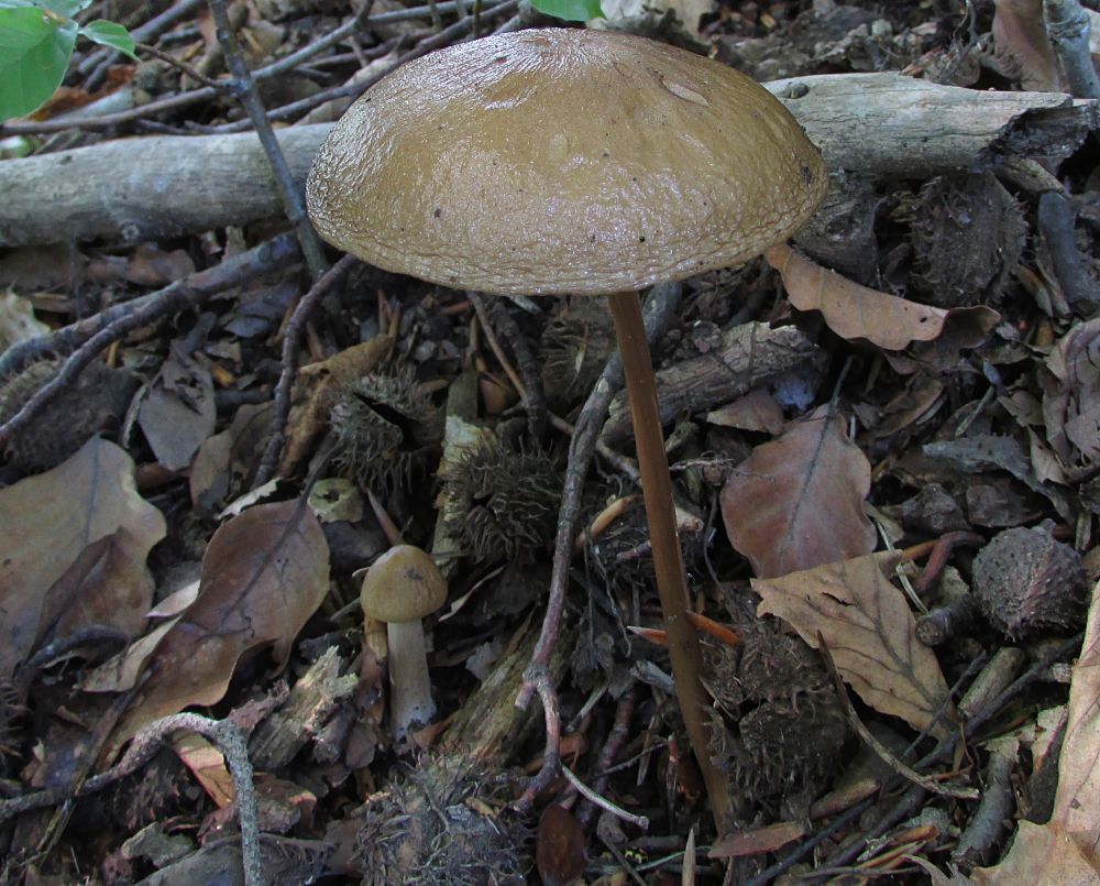 A tady jedna krasavice, buď slizečka ocasatá, nebo penízovka kořenující, vyberte si, co se vám líbí víc