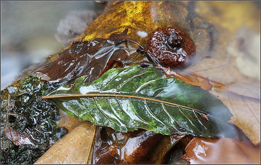 hele, já ti dycky záviděl ty lístky ve vodě a roky jsem je nenafotil. Dneska jsem, já blb, zjistil proč... Hledal jsem to na známých potocích. Jenže, to je otázka dne a hodiny. Chce to maličký potůček, spíše stružku - tam totiž ten proud to listí neodnese - nemá sílu. Jasně, jsou výjimky i na malém potůčku, ale i na větším, kde jsi ve správnou dobu na správným místě, jenže ta je šíleně pomíjivá. A tak jsem vsadil dnes na maličké toky... a mám to...