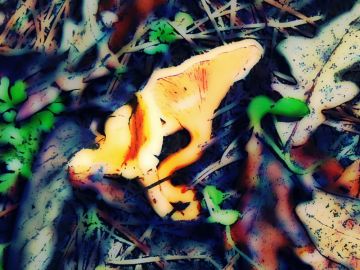 No a na závěr dám opět jednu neonovou, ta není ze současnosti, avšak z daleké nedaleké minulosti (spíš nedaleké). Trošku "tepelně" upravená - opět si neodpustím zeptat se vás, o jakou houbu se jedná, i když to tady možná bude "tipovačka". No, snad jsem to neudělal nezvládnutelný. (Dám nápovědu, aby to nebylo úplně zapeklité - může růst na zemi i na dřevě)