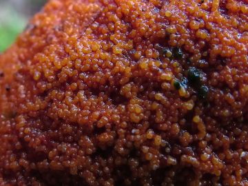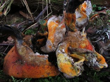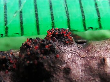 A tady je další zajímavý druh, já jim trochu neodborně říkám mykoparaziti nebo mykosaproparaziti, bo parazitují popř. někteří rozkládají jiné houby, což je u hub neobvyklé...tady jsou rážovky houbové, Nectria episphaeria, které parazitují na nějakých tvrdohoubách v olšině...