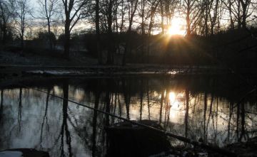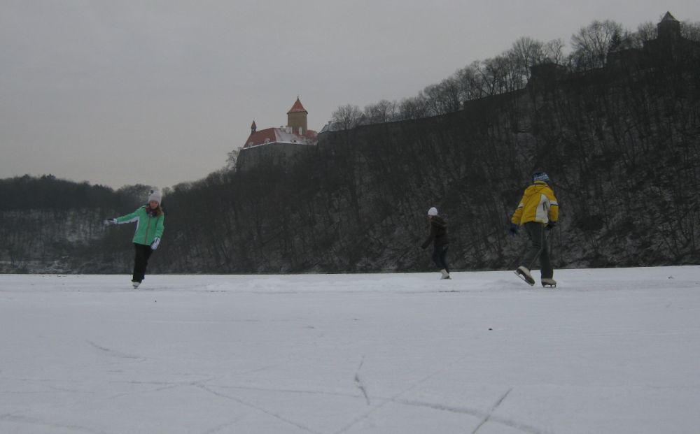 Technická: přehrada samozřejmě zamrzlá není. Po zimním upuštění ovšem zůstávají velkoplošné mělké kalužiny...