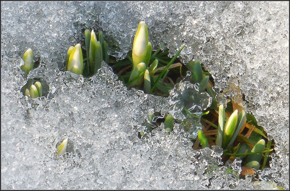 Přece jen jsme na seweru, sněženky většinou jen vykukují z ledového a sněhového příkrovu...