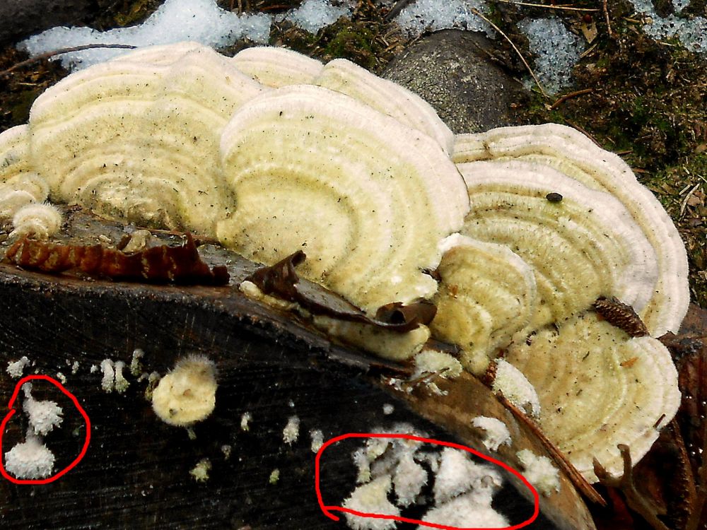 A nakonec hádanka pro vás: Na obrázku jsou outkovky chlupaté a ještě nějaký druh houby, který není na fotce tak nápadný. Poznáte, o jakou houbu jde ?