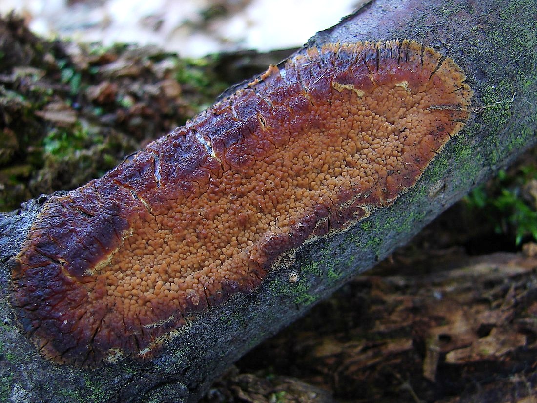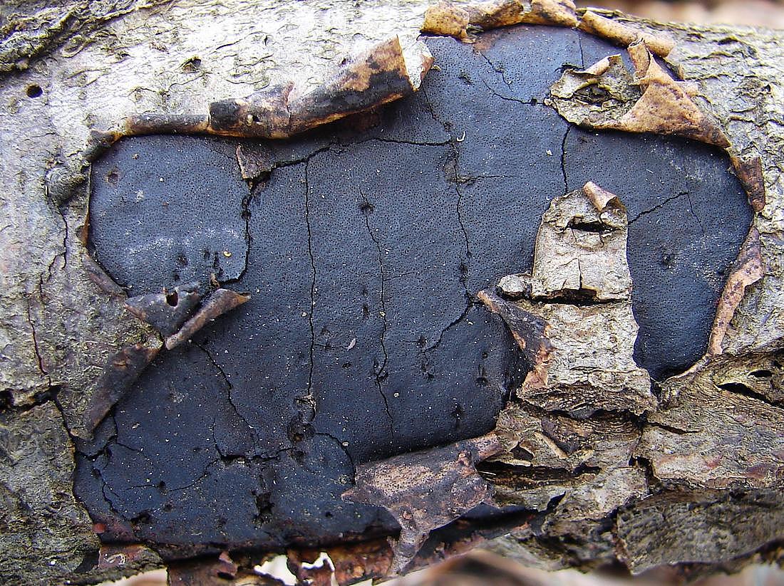 . Ale nějaká korovitka, možná tečkovaná (Diatrype stigma). Ale tvrdohub (pyrenomycetů) je strašně moc. Třeba v novým Hagarovi je tato skupina hodně děravá..