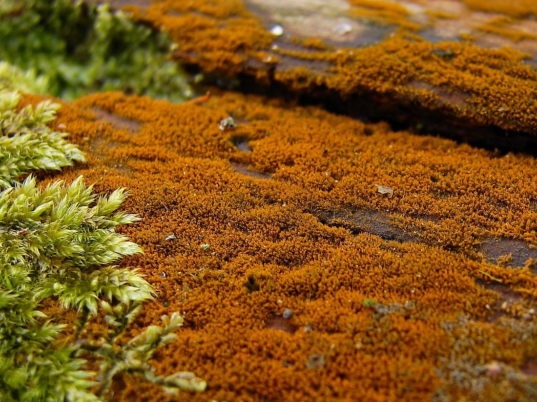 To vypadá na malý mech, zdá se mi, že tam vidím lístky...a možná je pokryt řasou rodu Trentepohlia.