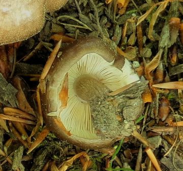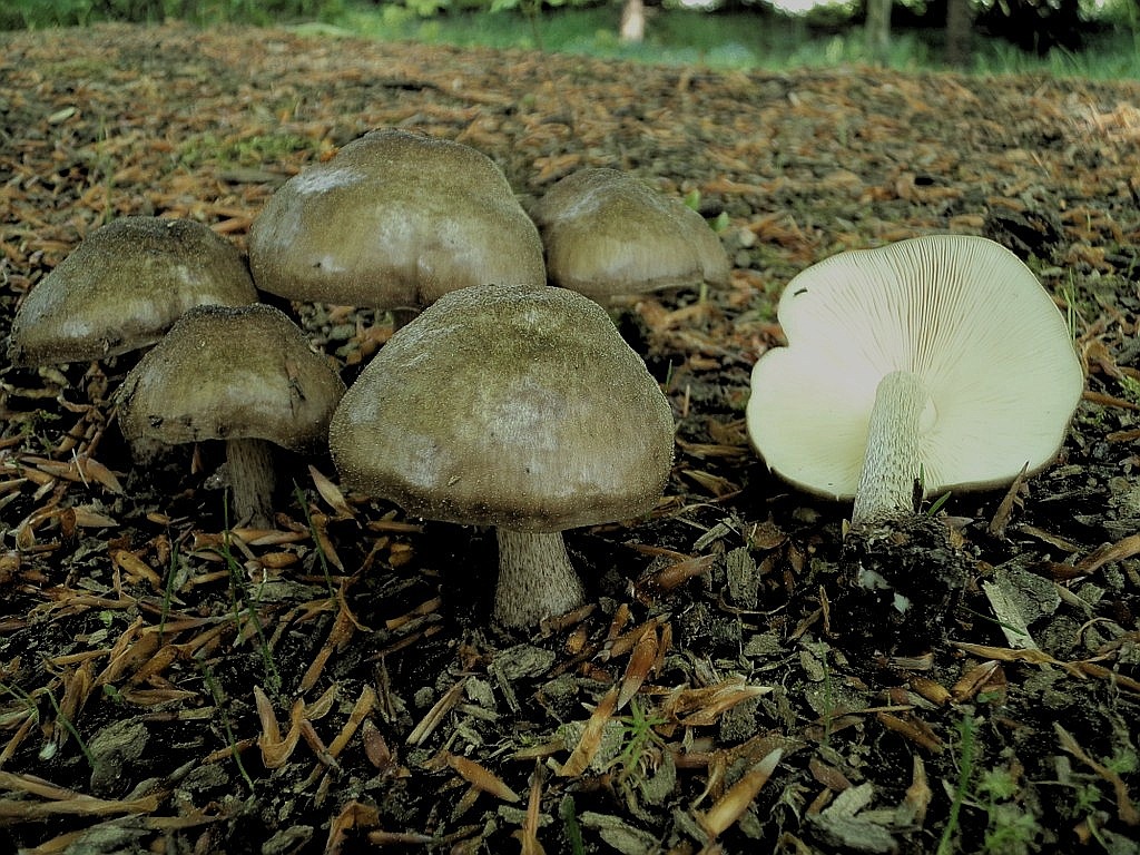 Barvy jsou posunuté trochu k zelené, ale na fotce s obrácenou malou plodnicí jsou vidět (pokud mě zrak neklame) výrazně volné lupeny. Také třeň i tvar klobouku sedí více na štítovku. Ono by bylo nejlepší, kdyby se tu všichni naučili, že tmavobělky mají lupeny zoubkem připojené (nebo mírně sbíhavé) a štítovky mají lupeny volné. Takže když potkáte houbu a bude mít "kolem nožičky u kloboučku kolečko" a pak teprve lupeny, tak je to štítovka. U štítovky se taky dá třeň snadno vylomit či vykroutit a klobouček se nepoškodí (není-li člověk kůrovec surovec).