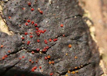 Pak jsem našla ještě ulítlý balón z poutě (ve tvaru kočky), anonymní počasnickou radiosondu (asi z ČHMÚ) a pěkné záhonky netýkavek žláznatých + kopřiv. Ale aby to nebyl příspěvek úplně bez hub, tak na závěr ještě jedna potvora, maskovaná jako cucací bonbón - Nectria sp. na Diatrype sp. na (asi) jasanovém klacku. Najde se tak, že vidíte diatrypku, která má zblízka trochu divně načervenalý odstín místo čistě černé, a pod lupou se pak objeví i rážovky.