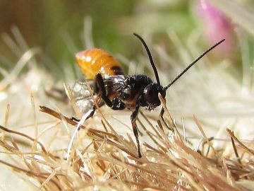 Jiná blanokřídlá minipotvůrka si čistila křídla na odkvetlém bodláku...
