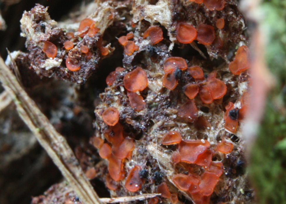 Až na displeji při velkém zvětšení jsem si všimla, že okolo jsou i nějaké červené askomycety. Čertví, co to je za potvoru, snad kruhovka (Orbilia), ale jistá si tím moc nejsem. Kromě nich tam byly ještě staré plodničky klanolístky, jiné druhy hlenek, nějaký lišejník, kožovka asi rezavá + cosik bílého s rozlitými plodnicemi - celkem zajímavý kus dřeva.