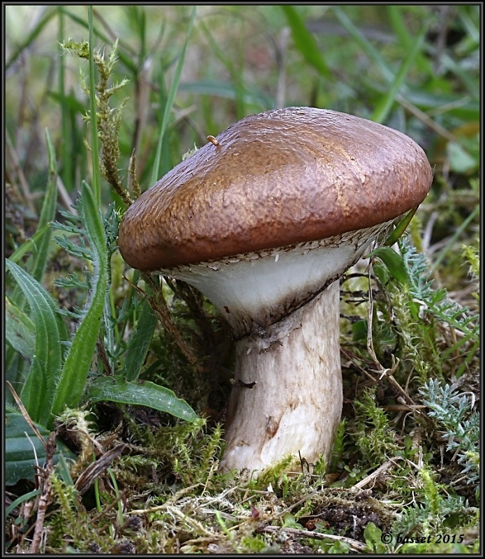 klouzek obecný - asi o pět metrů blíž než kozák. Proč chodit do lesa, když v okolí jídelny rostly i další houby - muchomůrka červená, ryzec borový, kozák černohlávek (toho jsem sice fotil, ale fotograf selhal